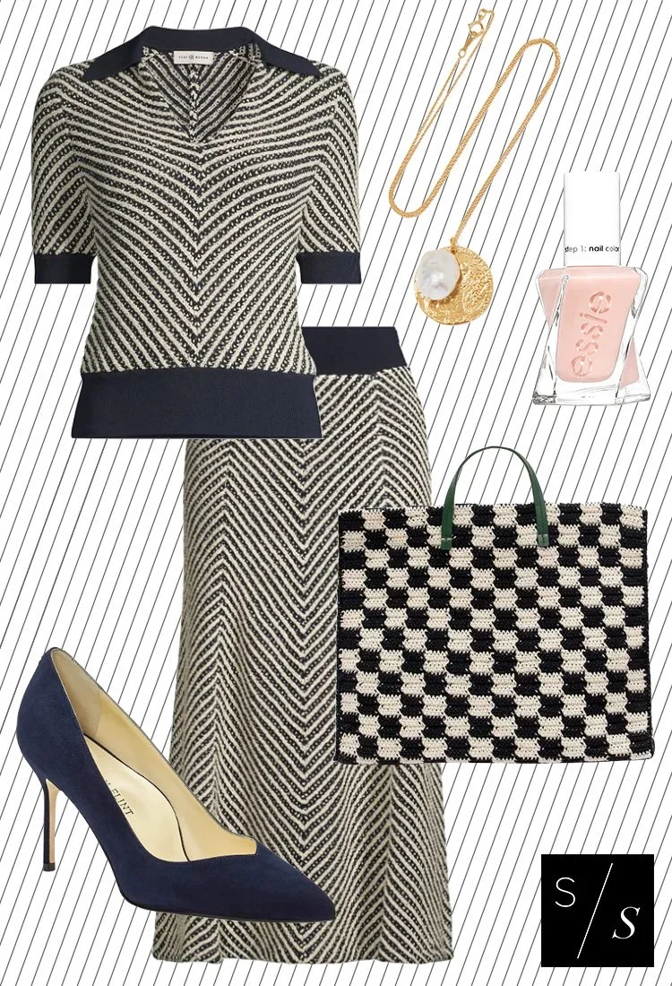 Split the set and pair the jacket with a blue-toned blouse and white jeans for a dinner out. Tuck in a silky blouses with the skirt and pair with flats or mid-heels for an office appropriate look.